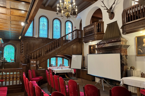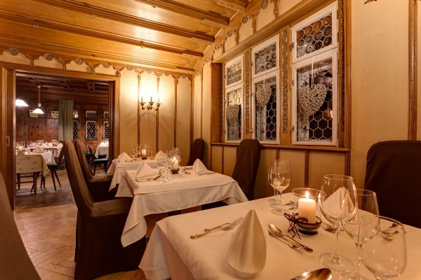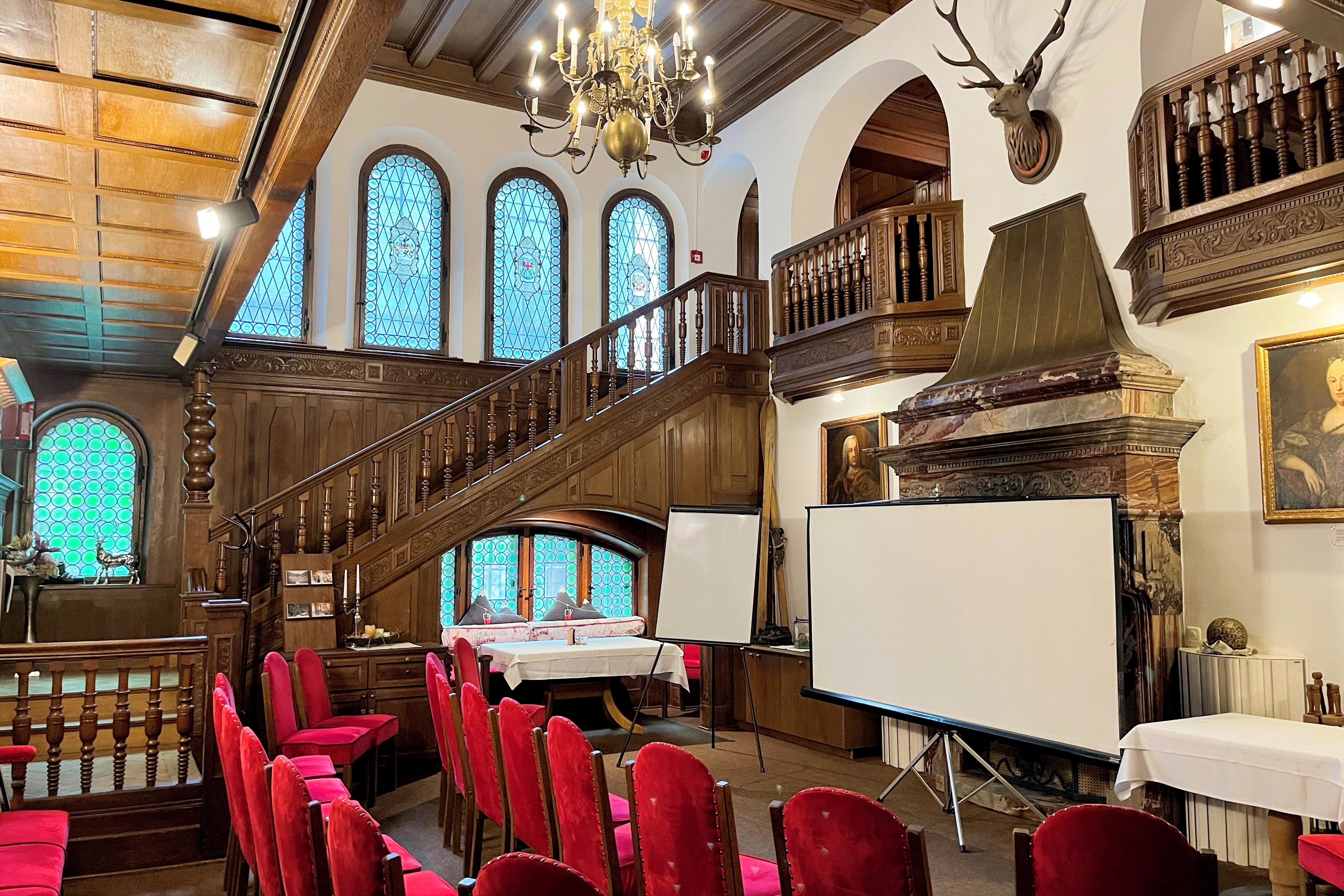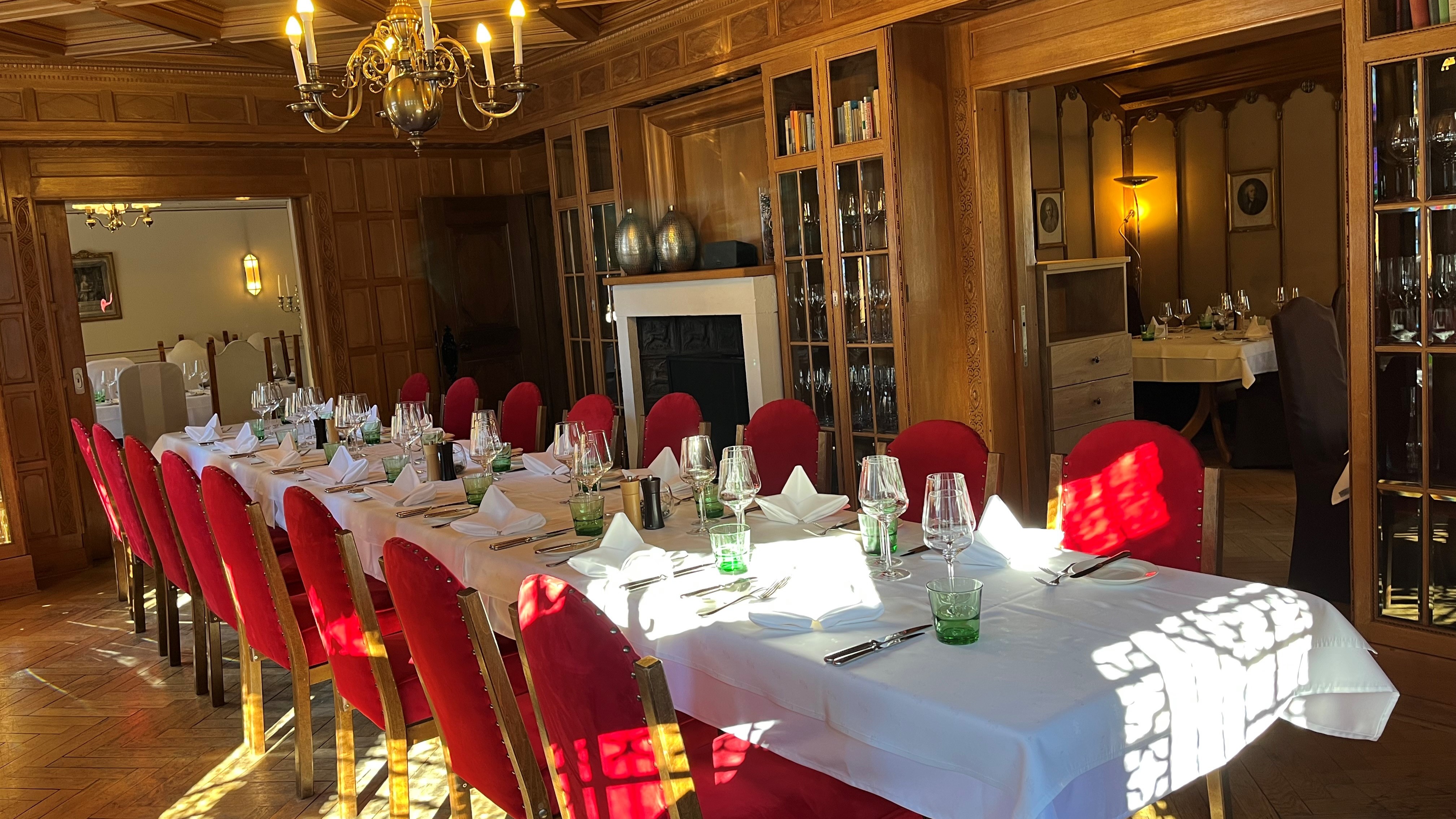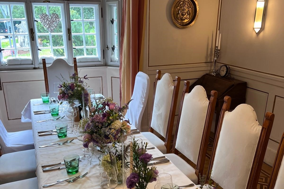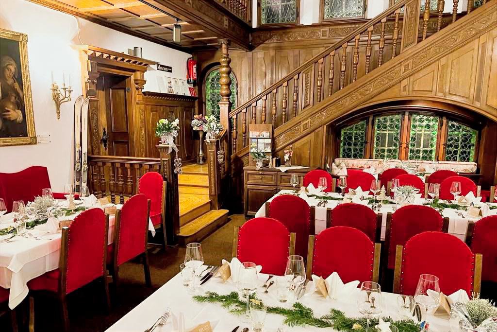 Der Empfang kann auf der Terrasse oder in einem der Eingangsbereiche beginnen, bevor der Abend nahtlos in ein Dinner in den historischen Stuben übergeht. Für größere oder lebendigere Anlässe wird die Kaminhalle zum zentralen Ort für Ansprachen oder den weiteren Verlauf des Abends.
