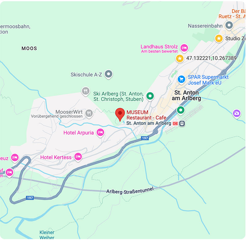 The St. Anton Museum is located within easy walking distance to the village center and next to the ski slope. From Arlberg Federal Road, drive to the village center at the roundabout next to the new Rendl Gondola Base. Continue for about 100 meters and take the second exit in the second roundabout. Follow signage to the Museum.