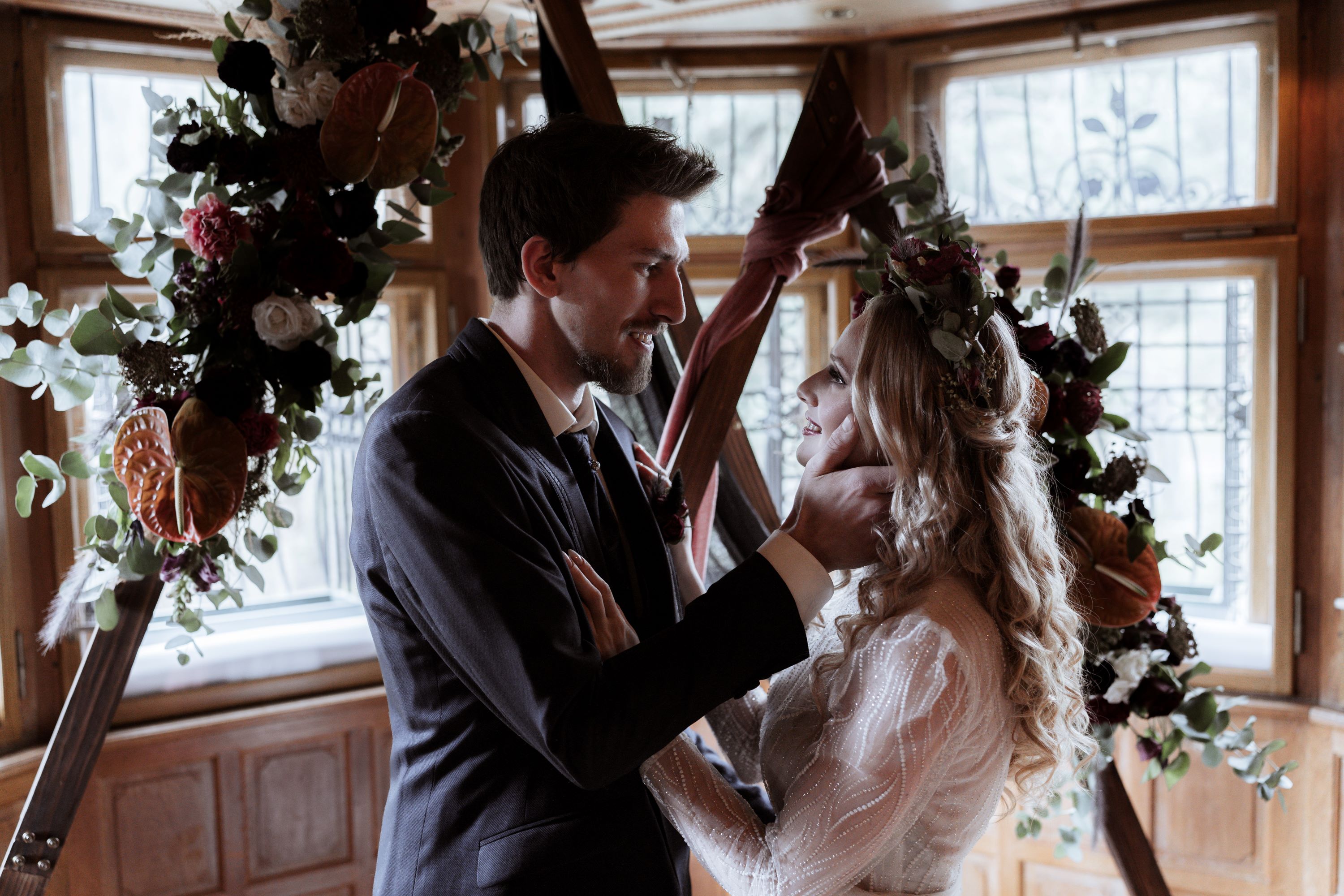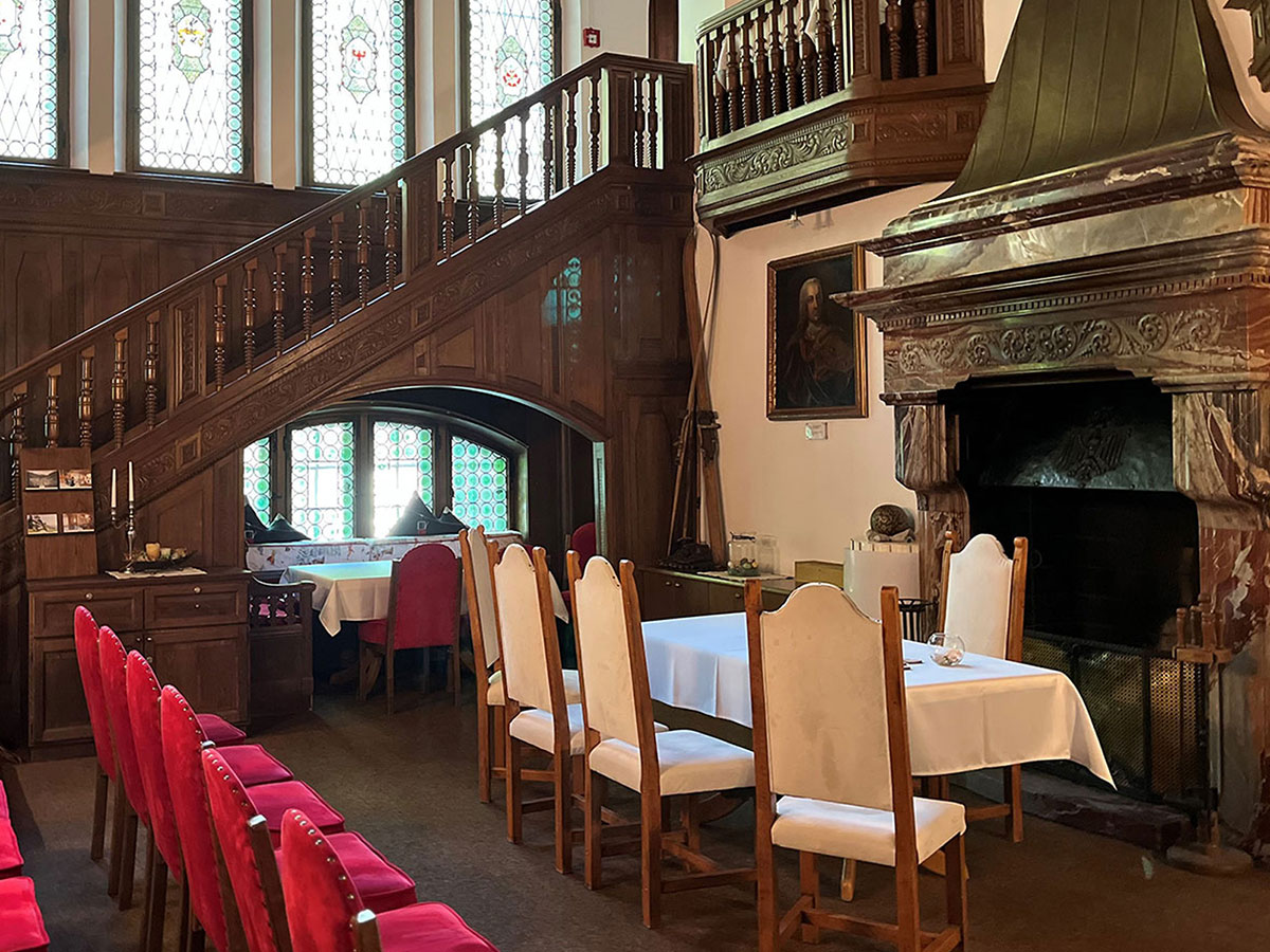 Inside, the elegant design of the grand hall, with its historic details and inviting atmosphere, creates a romantic setting for exchanging vows.